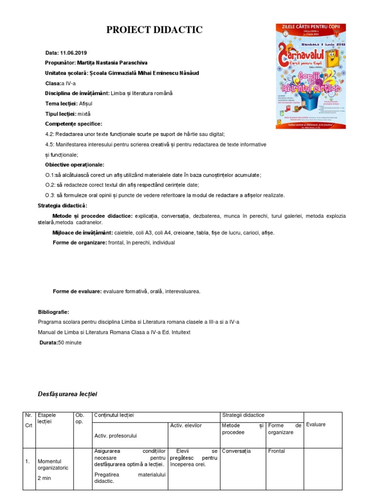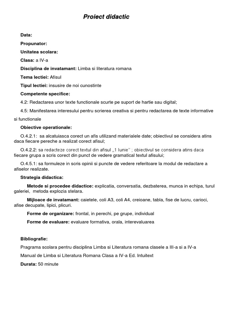 Proiect Didactic Lb Si Lit Romana Afisul Clasa A Iv A