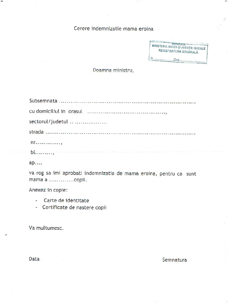 Cerere Indemnizatie Mama Eroina