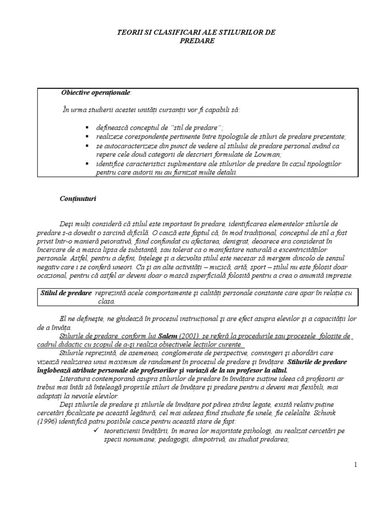 Teorii Si Clasificari Ale Stilurilor De Predare